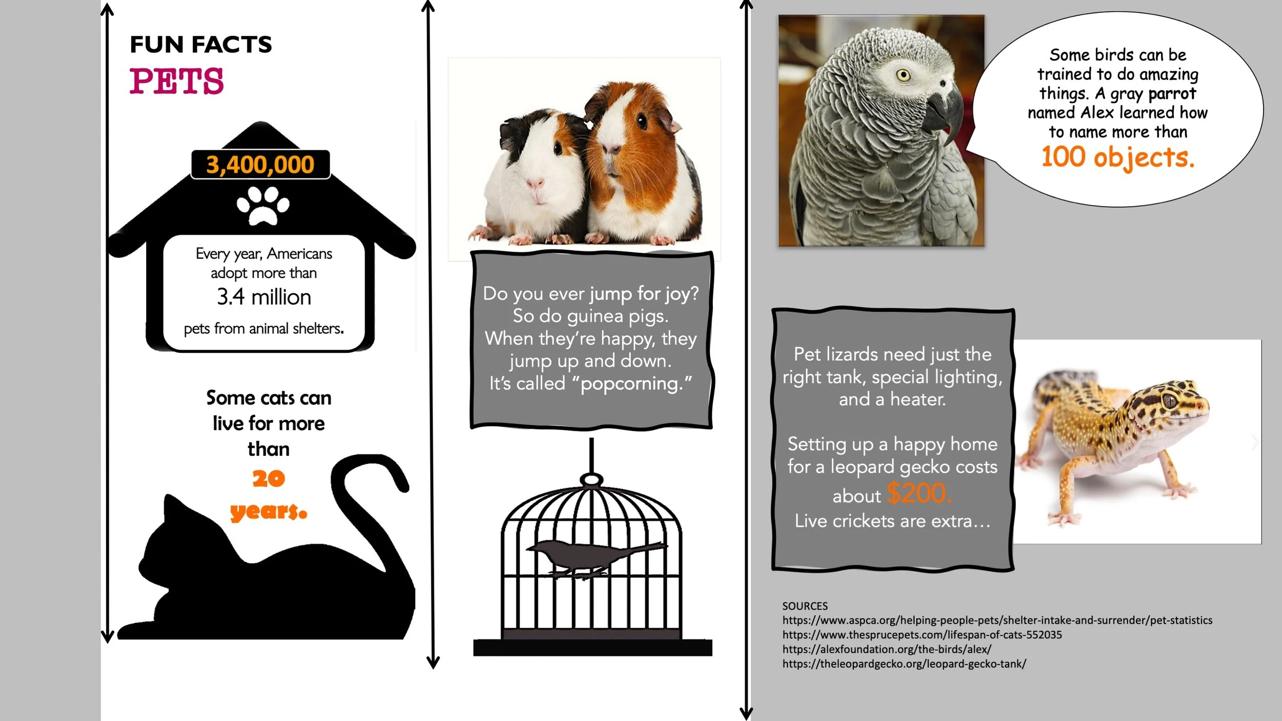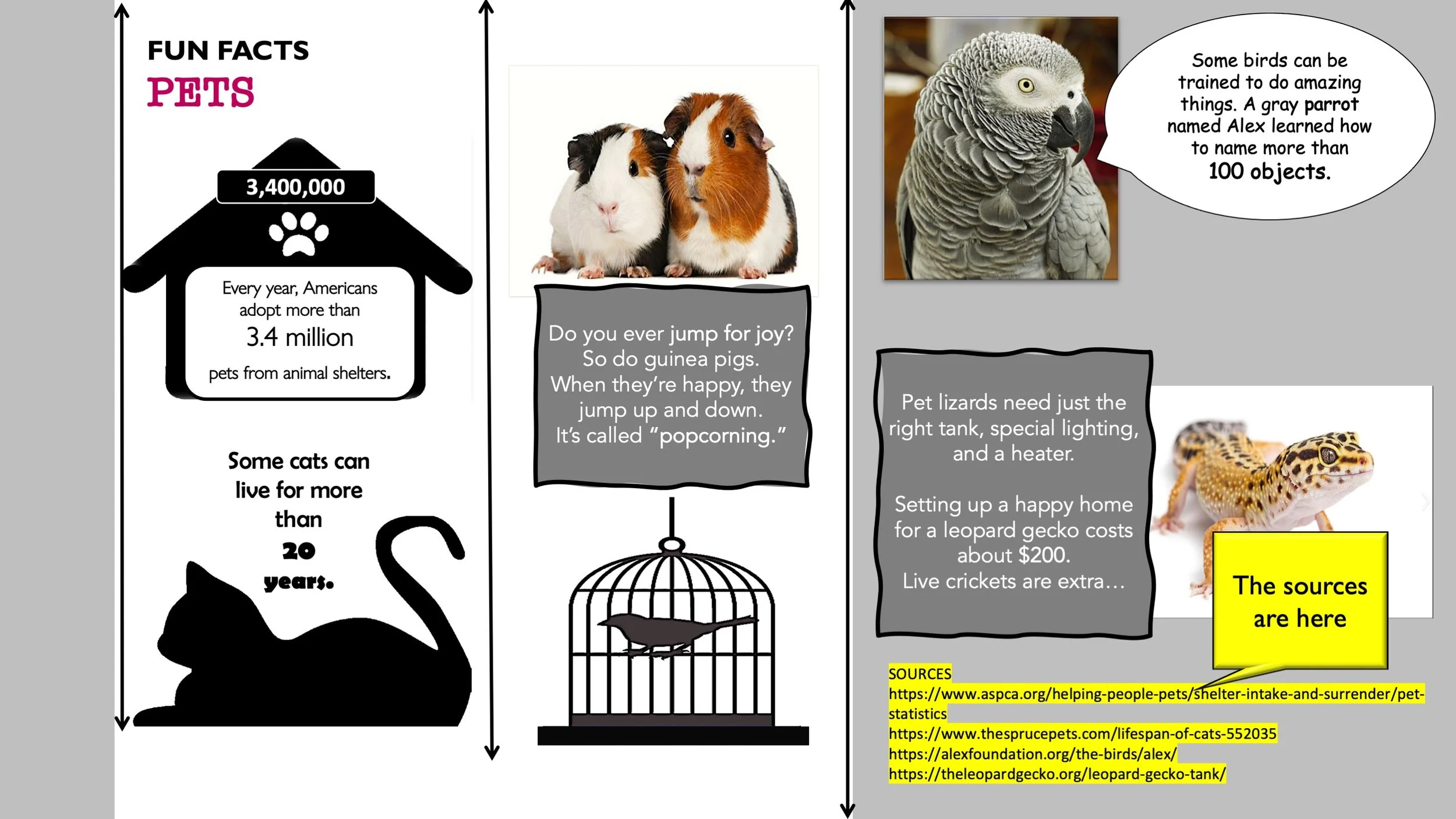 Find the list of sources to see where the data come from. The sources for this infographic include an animal rescue organization, a group that sponsors scientific research about parrots, and a website for exotic reptile lovers.