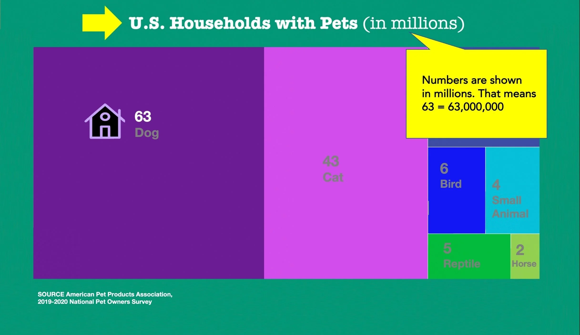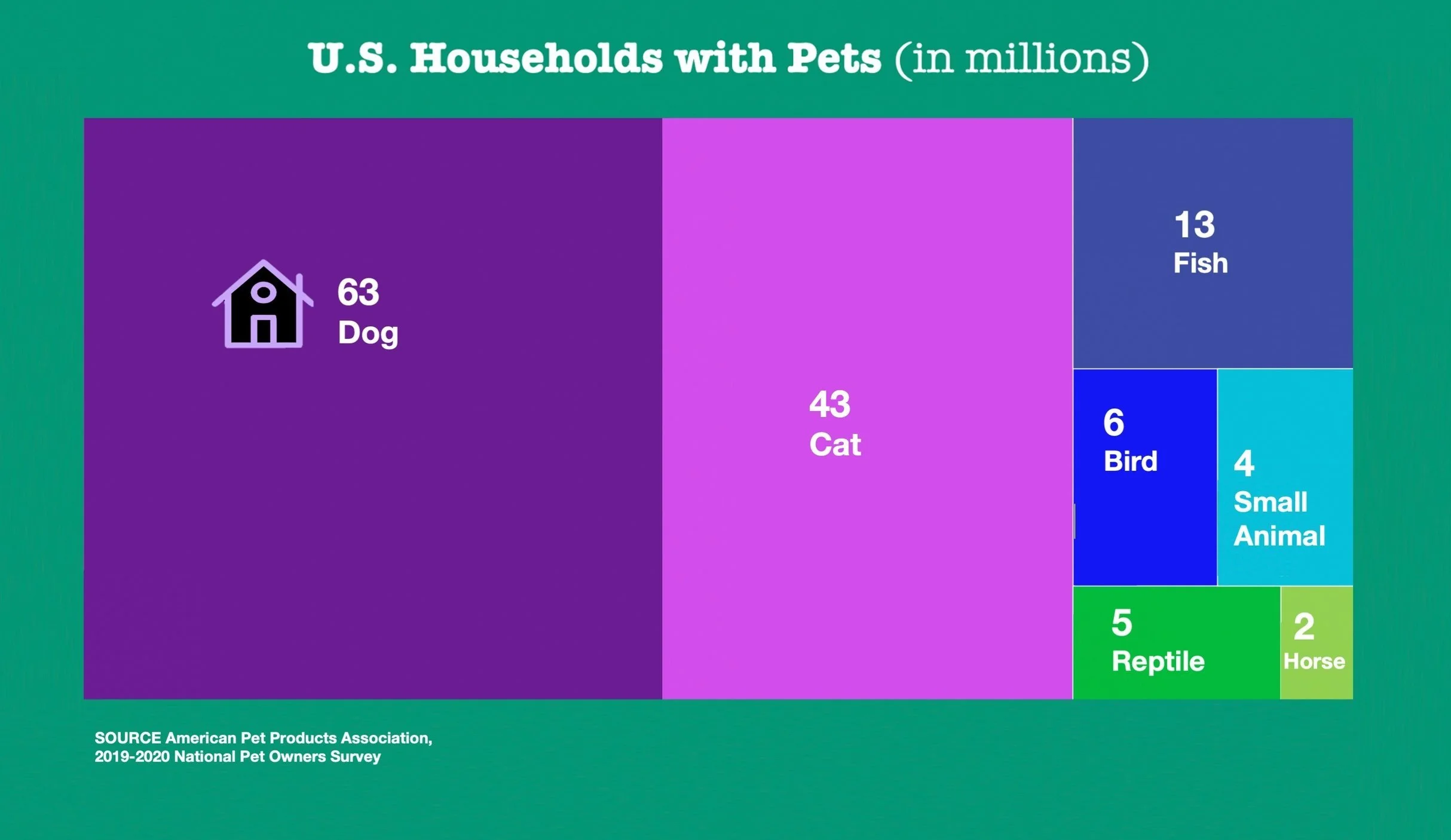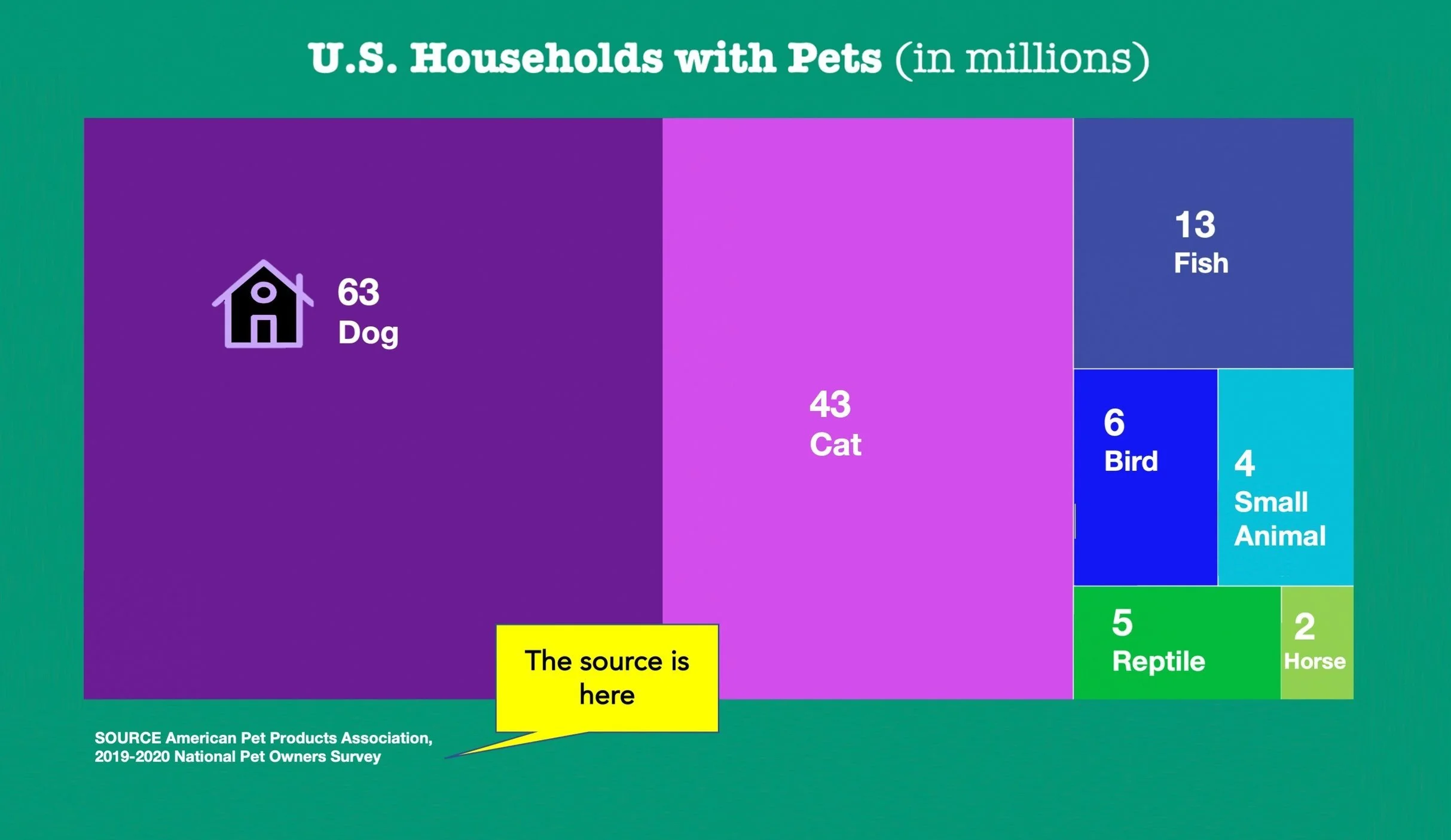 Read the title closely to get an idea of what the treemap is about. There can be a lot to unpack even in a short title. This treemap compares the number of households in the United States that have certain types of pets.