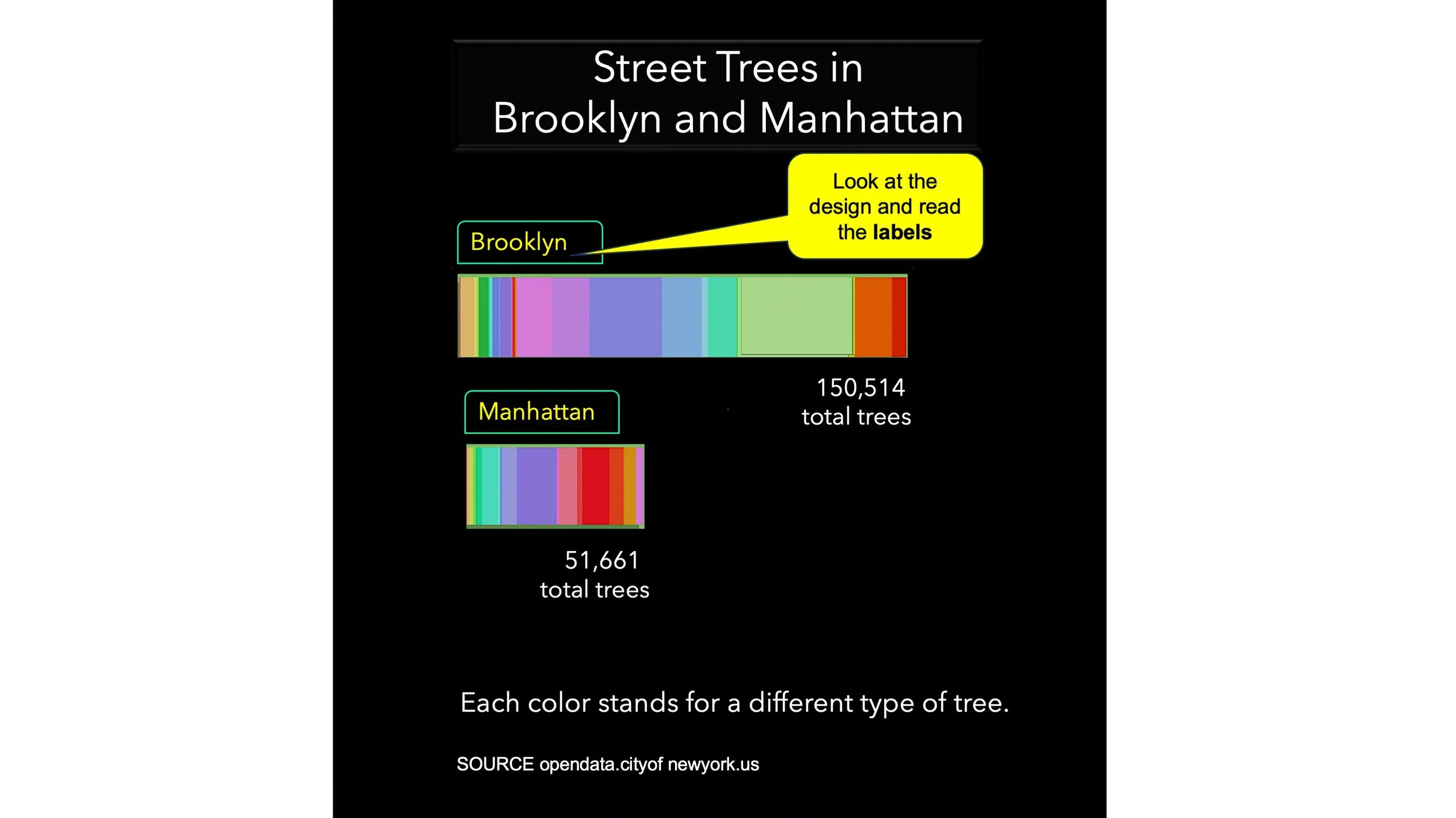 Now find the source. The website publishes free public data collected by New York City. In 2015, the city conducted a census to count every street tree growing in every part of the city. The raw data were downloaded from the website, analyzed, and then “visualized” into these stacked bar graphs.